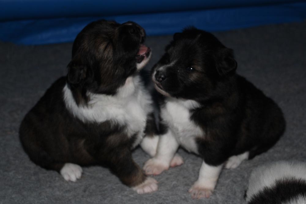Unser C-Wurf ist 7 Wochen alt. Inzwischen haben die Welpen zum Toben und Spielen den größeren Auslauf bezogen. Auch haben sie nun ein Halsband um und fanden es nach wenigen Minuten schon ganz normal.