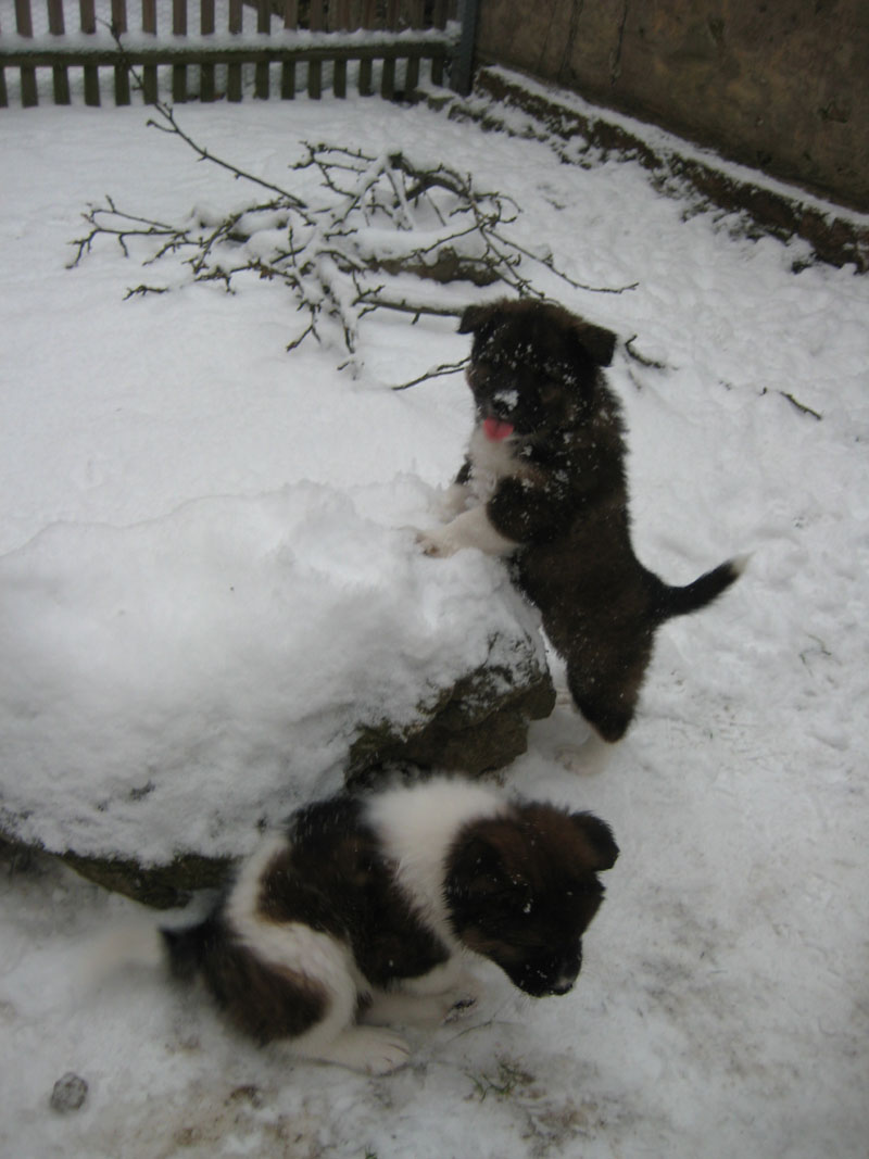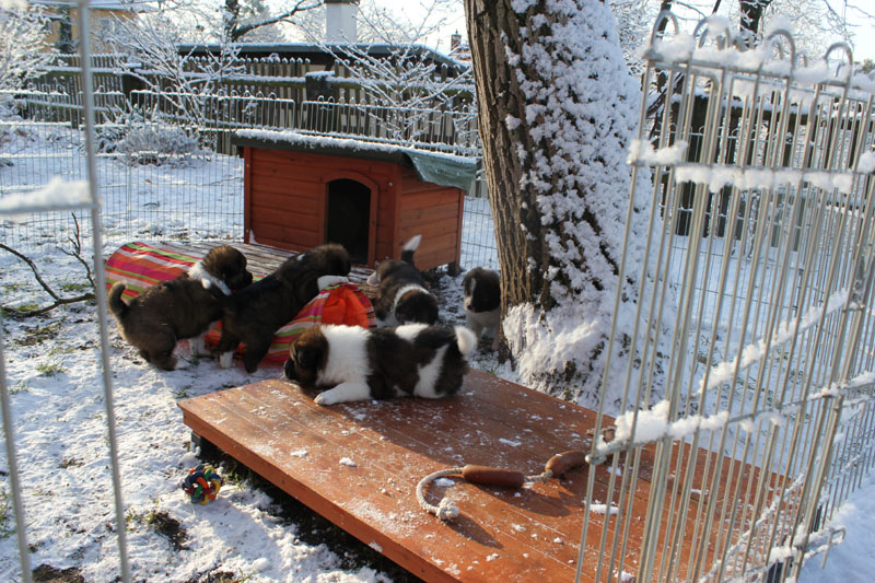 Freilauf im Garten bei viel Schnee macht großen Spaß. Auch Luna beteiligt sich an der Betreuung und Erziehung der Welpen.