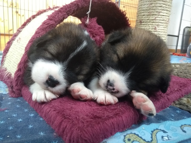 Unser kleines Kleeblatt entwickelt sich prima. Gut versorgt von Mama- Enya nehmen die Kleinen schnell zu und sind schon recht munter und mobil in der Wurfbox.